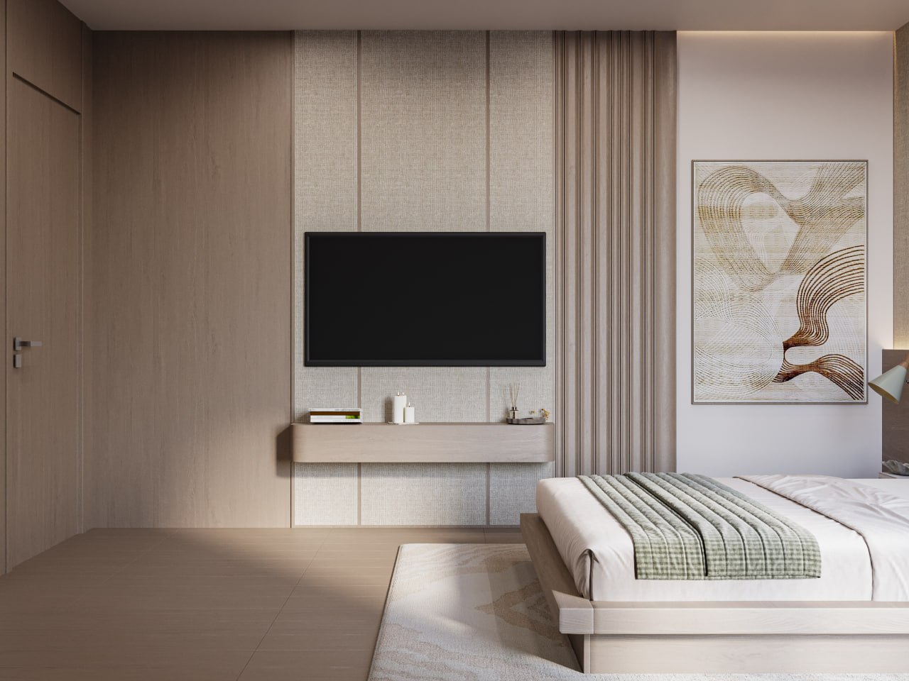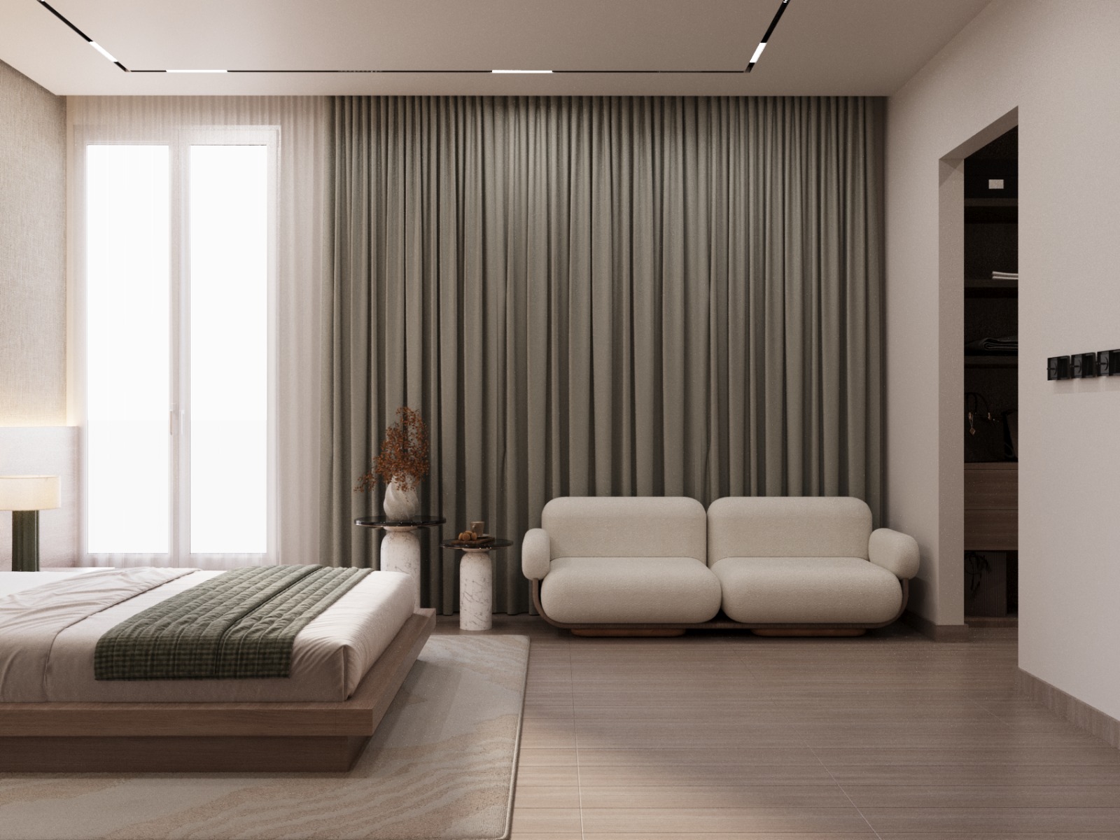 تضم الشقة غرفة نوم رئيسية بتفاصيل هادئة وألوان دافئة تعزز الاسترخاء، وصالوناً بتصميم معاصر يوازن بين الطابع العملي والجمالي.